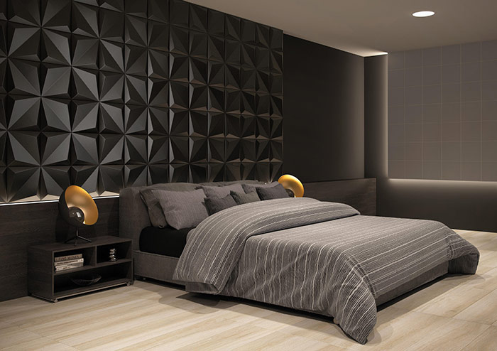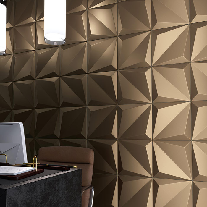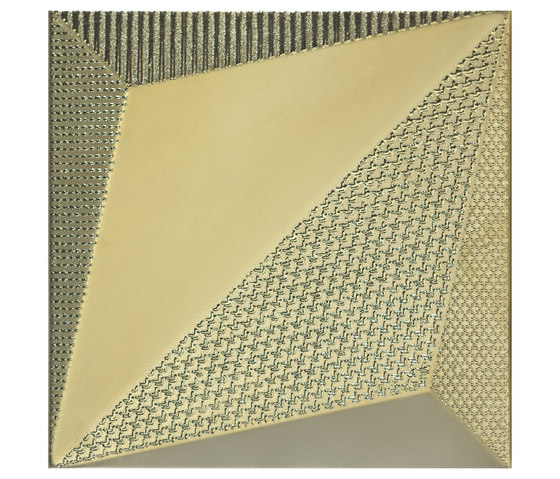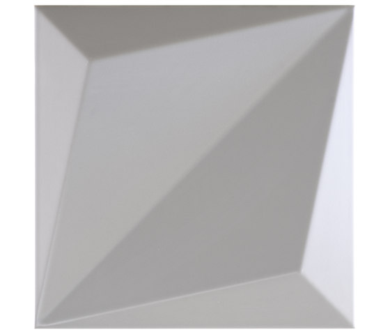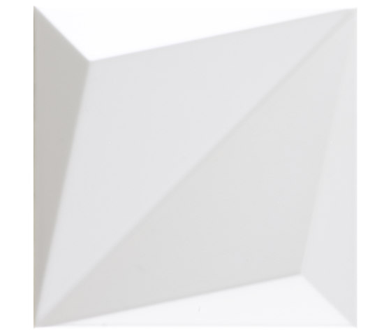 אריח עם הבלטת 3D סימטרית בחלוקה אלכסונית המאפשר שפע של וריאציות בדרך בה משתמשים בו כדי להשיג משחק של חתכים ועיצובים בהדגשת האור.